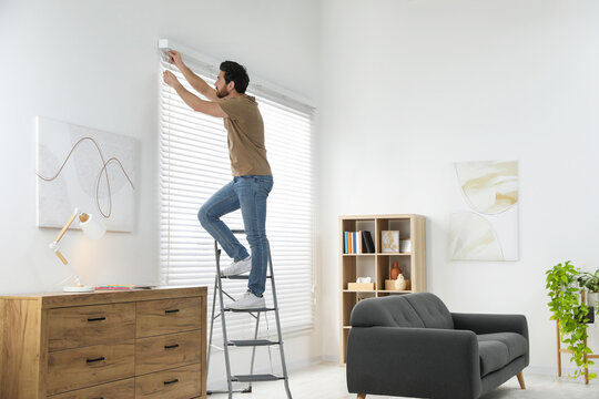 Metal step ladder with wooden steps standing in modern empty room with bright beige wall and wooden floor in contemporary interior design space.