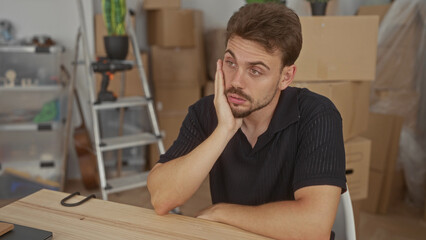 Man with hand on forehead sitting at a table surrounded by packed moving boxes and a ladder in a building; moving stress.