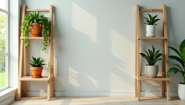 Green ladder against leaf shadow on vibrant tropical backdrop
