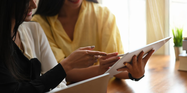 Photo of costume designer team working with computer laptop and tablet while sitting together at the wooden working desk over comfortable workplace as background.
