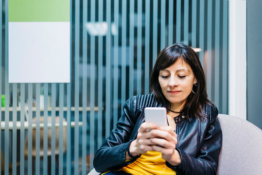 Portrait of a young woman using mobile phone on the sofa