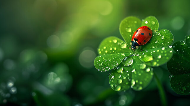 A ladybug crawls on a four-leaf clover, dew