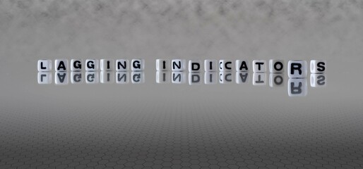 lagging indicators word or concept represented by black and white letter cubes on a grey horizon background stretching to infinity