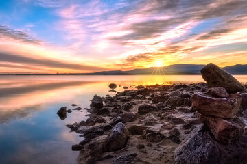 A breathtaking sunset over Lahontan, showcasing vibrant hues reflecting on calm water with mountains in the background