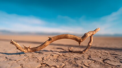 Arid landscape reveals weathered branch on cracked lakebed beneath a vast clear blue sky