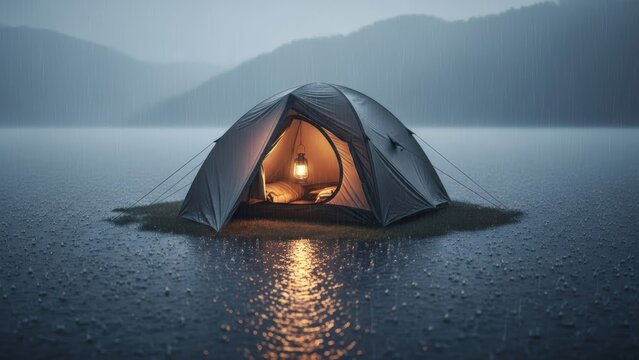 serene rain-soaked lakeside camping tent illuminated at dusk with surrounding