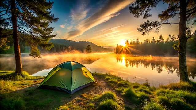 Serene lakeside camping experience amidst a breathtaking sunrise with golden rays illuminating the misty water