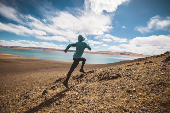 Ultra marathon runner running at winter high altitude lakeside, Tibet