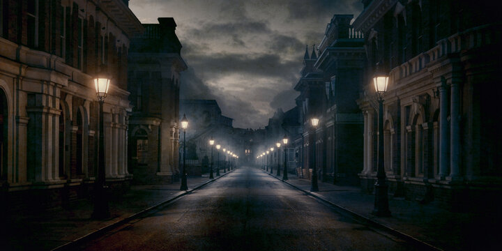 Victorian street lanterns glowing and casting warm light through falling snow at night