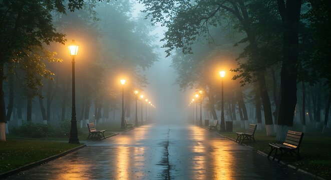 Misty Rainy City Park with Warm Glowing Vintage Lamp Posts, Wet Reflections, and Arching Green Trees in Morning Fog