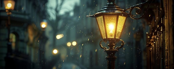 Victorian street lanterns glowing and casting warm light through falling snow at night