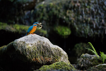 A kingfisher bird sat on a rock with a lamprey prey