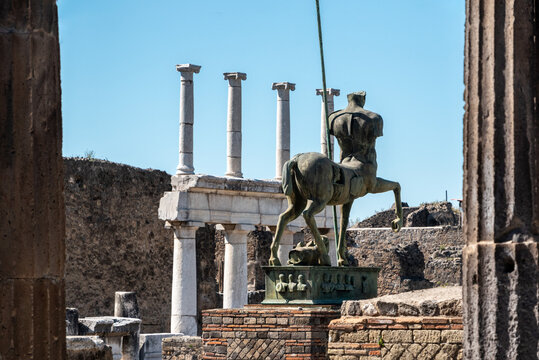 POMPEII, ITALY - MAY 04, 2022 - Beautiful statue of an ancient lancer on the forum of the ancient city of Pompeii, Italy