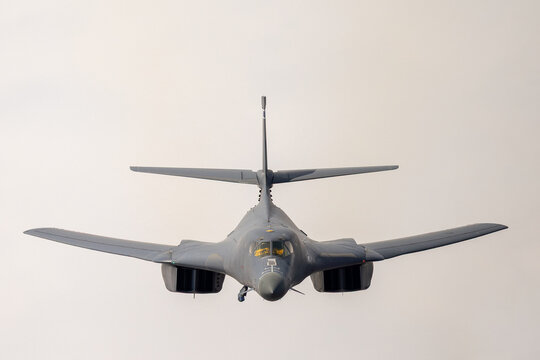 Very close frontal view of a a B-1 Lancer  flying with wings in full sweep