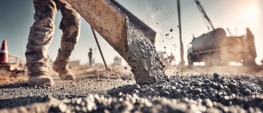 Pouring concrete on a construction site during sunset with workers and machinery in the background