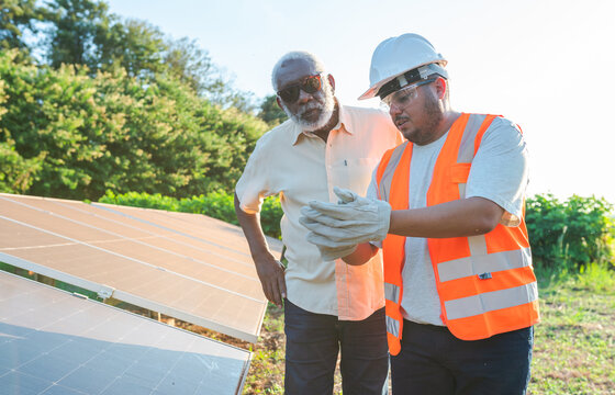 Brazilian landowner watching as technician completes the installation of solar power generation panels on his farm in Brazil