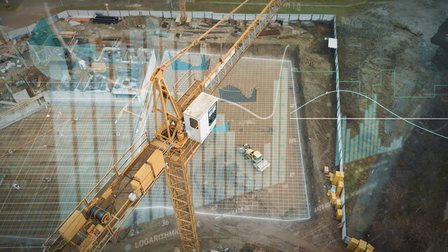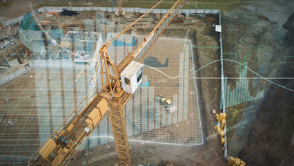 Yellow crane in construction site with graphics for production trend and control of workers team. Potential investiment income calculator. Aerial