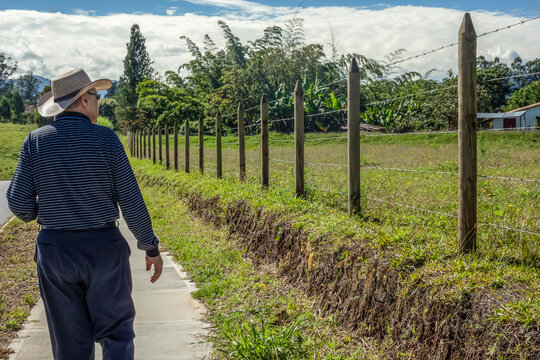 Senior hispanic landowner walking next to his farm in Colombia