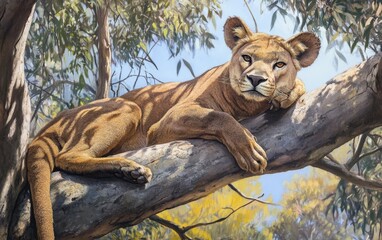 A powerful Thylacoleo, the enigmatic marsupial lion, lounges atop a sturdy branch in a dense, sun-dappled eucalyptus forest, its sharp gaze scanning the tranquil landscape for any sign of prey