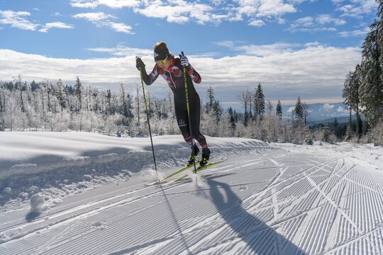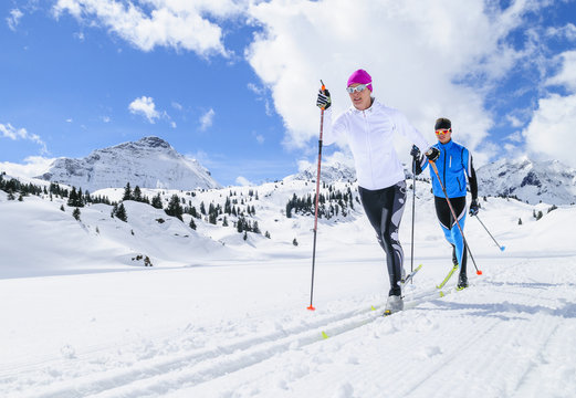 beautiful active senior woman cross-country skiing in fresh fallen powder snow in the Allgau alps near Immenstadt, Bavaria,