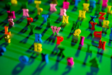 Latin characters with focus in the center. English letters stand on a green background and cast shadows. The letters of the alphabet in random order. The concept of Literacy on a green background.