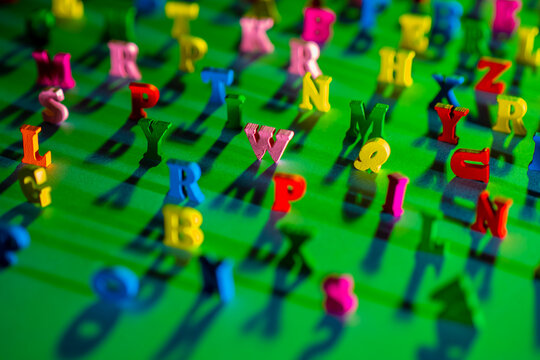 The concept of literacy. Letters of the Latin alphabet. Multi-colored English letters are placed on the table in any order. Reading books in English.