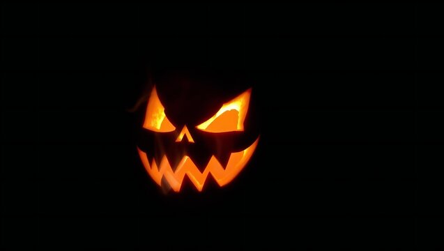Spooky orange jack o lantern with glowing eyes and jagged mouth filled with fire and smoke halloween