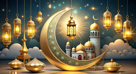 Ramadan celebration with lanterns, crescent moon and mosque illustration