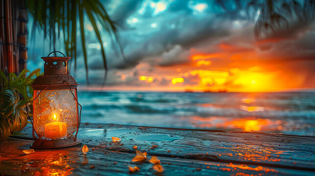 Artistic depiction of a lantern on a beach, with a vivid sunset over the ocean