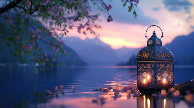 Arabic lanterns with burning candles against the backdrop of majestic lakes and mountains under the soft light of dusk