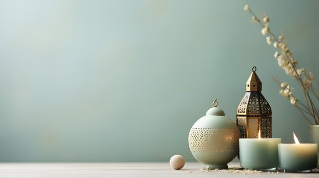 Arabic lantern in soft green shades, providing a peaceful atmosphere and room for customized text or messages. Ramadan concept