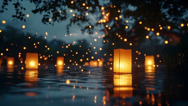 Floating lanterns on a tranquil water's edge at night, illuminated by soft light.  Peaceful, glowing ambiance