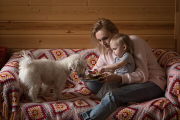 Mother reading book to child at home sitting on sofa with white fluffy dog
