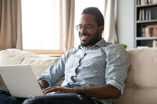 Smiling African American millennial man freelancer sit on couch in living room working on modern laptop gadget, happy biracial young male relax on sofa at home browsing wireless Internet on computer