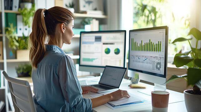 A woman sitting at a white desk with two monitors, a laptop and paper on the table; she is looking at one of her screens displaying a green bar graph showing growing sales numbers. Generative AI.