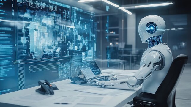 Person using laptop with digital icons representing technology and artificial intelligence at an office setting in the morning
