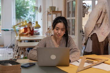 Captivating display. Lively multicolored paint splashes gently flowing from laptop screen