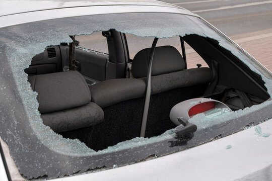 The rear window of a car shattered and removed, items were stolen. Crime scene.