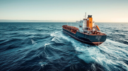 Large cargo ship navigating on open ocean under clear sky, creating wake in blue water, showcasing shipping industry and maritime transport at sunrise or sunset.