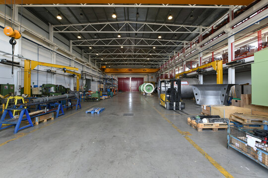 Large industrial turbine engines sit in a factory workshop. Giant metal components are arranged in a line ready for assembly or maintenance. Heavy machinery fills the production facility.
