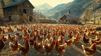 Hens in rural coop pecking straw illustrate eco-friendly farming