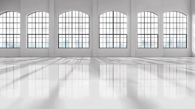 Bright, spacious hallway with large windows, blurring into a cityscape view; light reflecting off the polished floor creates depth