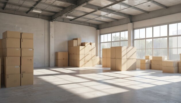 Bright empty room with large windows and light wood floor and white brick wall and sunlight streaming in