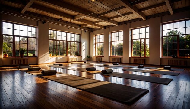 Yoga mats unrolled in rustic-modern studio with large grid windows at golden hour, warm sunlight casting long soft shadows on polished wooden floor for serene evening practice