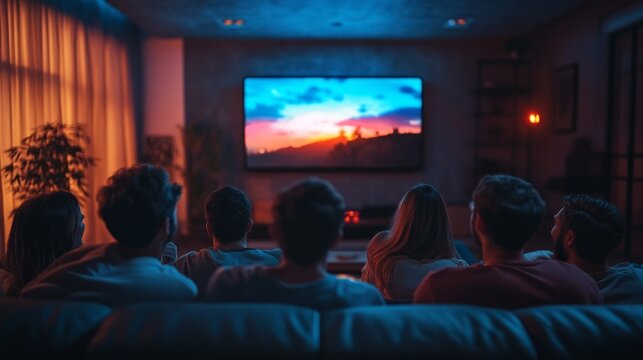 Empty modern cinema theater auditorium rows with glowing blue lights and large screen
