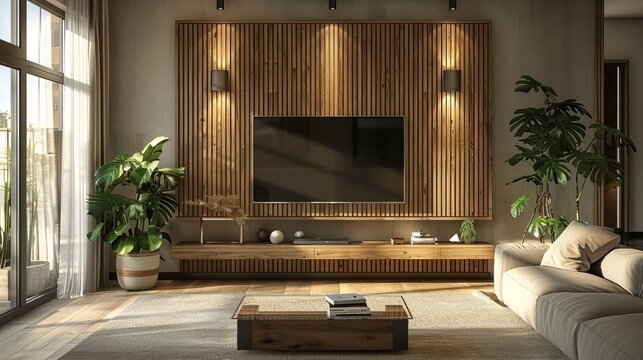 Design a warm and inviting living room space with a large wooden TV wall unit