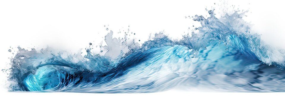 Large stormy sea wave in deep blue, isolated on white. Nature of the climate. in front, Big breaking blue ocean wave. Surfing summer wave banner, fresh and spray, white background with copyspace