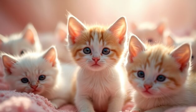 Several adorable fluffy kittens gather closely together on soft pink blanket. One ginger, white tabby kitten gazes directly forward with wide blue eyes. Kittens, mostly white, visible in background,