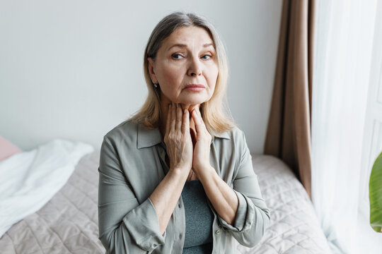 Indoor portrait of worried senior woman siting on bed in bedroom examining her thyroid, touching her throat, looking aside with anxiety, trying to find symptoms of severe endocrine disease
