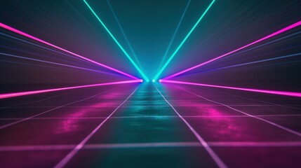 Neon laser tunnel with magenta and cyan beams radiating through foggy symmetrical space